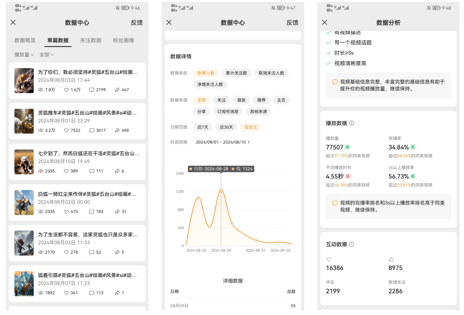 先上个数据,播放量虽然不是很高,不过互动量相当高,涨粉也很不错,其中最高的一篇 77000+播放的,涨了 2200+的粉,平均 34 个播放就涨一个粉。