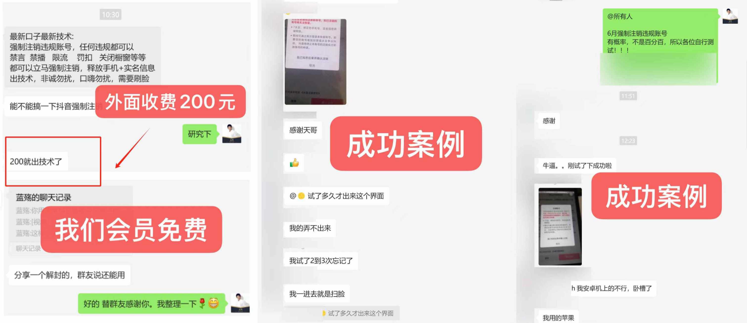 7、会经常更新一些会员免费的技术课程:例如常年更新的市面上的各类搬运技术、内录搬运技术、秒注销技术、封号注销技术(当时帮助了很多会员解决封号问题,现在已经和谐,后期如有还会群内通知),小和尚说话、老者思维、AI风景、AI换脸,真人数字人等技术,近期的核对技术,解封技术,释放实名技术等。