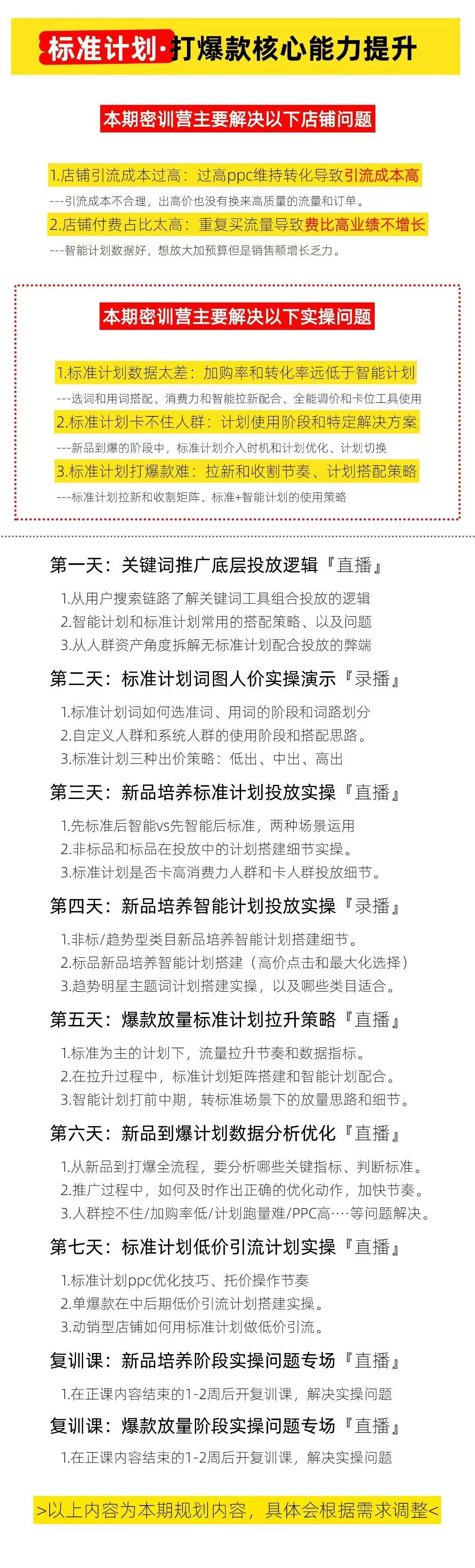 - 标准计划,新品到爆计划搭建,新品到爆分析优化,打爆款,关键词推广,全店动销,选品,短视频等